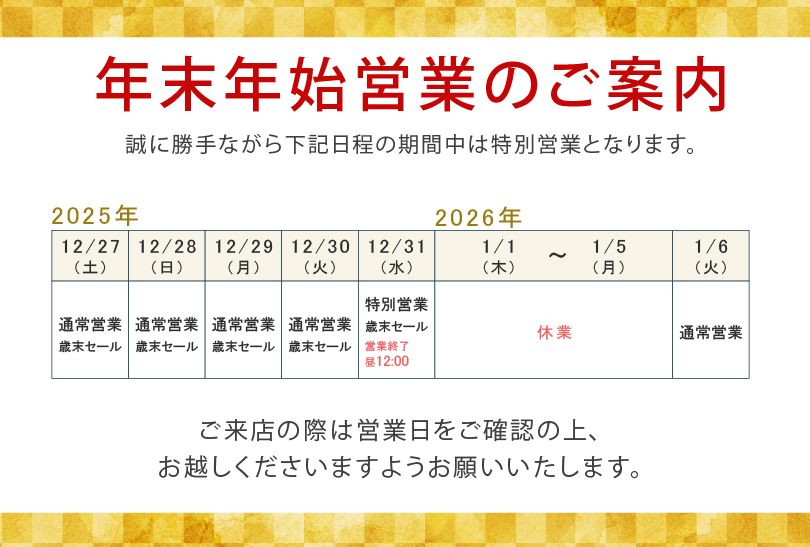 ご不便をおかけいたしますが、ご来店の際は営業日をご確認のうえお越しください。